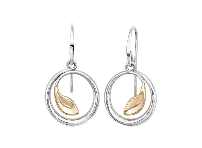 A cozy circle reveals a hand-forged leaf—an airy, everyday pair with sterling silver and 14K gold accents. Approximately 1 1/8" long. The emerging leaf is a harbinger of early spring and good things to come. Our beautiful leaf sprouts from these earrings and companion pendant in sterling silver or gold.